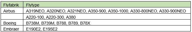 CPH og andre lufthavne vurderer at følgende flytyper kan defineres som en ”ny flytype”, ud fra ovennævnte beskrivelse, sammenlignet med flytypens tidligere udgaver: